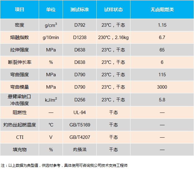 阻燃尼龍6系列包括無鹵阻燃以及溴銻阻燃,能滿足0.4mm、0.8mm、1.6mm以及3.2mm V0阻燃級別, 應用于對阻燃性能要求較高的產品。另外還可以為客戶量身打造高灼熱絲和高CTI的產品,詳細物性參數見下表。