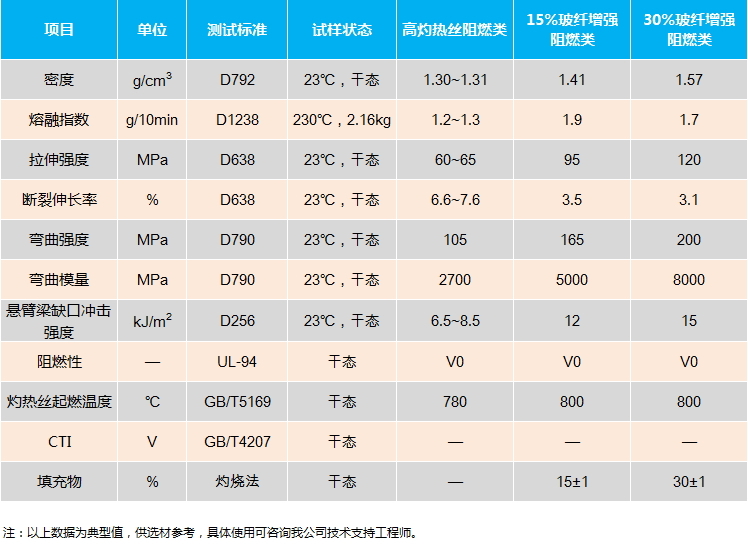 含鹵阻燃尼龍66系列產品能夠滿足0.4mm、0.8mm、1.6mm和3.2mm V0 阻燃,廣泛應用與電子電器絕緣件、精密電子儀器部件、電工照明器具和電子電器的零部件等,可用于制作電飯鍋、電動吸塵器、高頻電子食品加熱器等。詳細物性參數見下表。