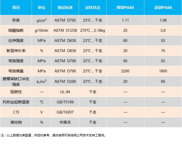 除此之外,電子電器和機械行業等領域也有增韌尼龍66的應用,常見的有:軸承保持架、扎帶、輪罩、接插件、電子電器部件、汽車零部件、醫療器械配件、紡織機械配件、管鉗、塑料模具等、冰鞋、滑雪板零件、網球拍線套、帆板連接器等。詳細物性參數見下表。