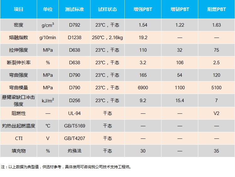 PBT廣泛應用于電子電氣家電等行業,如電子電器零件、接插件、連接器、變壓器骨架、開關零件、節能燈殼、日光燈座等。詳細物性參數見下表。
